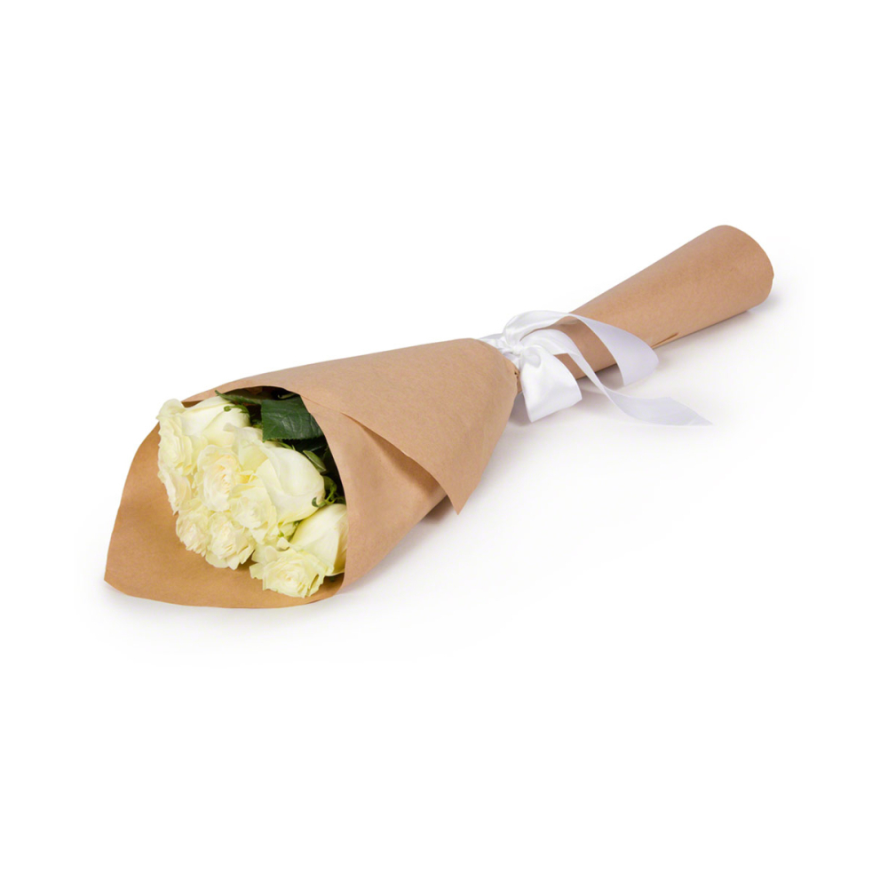 Изысканный букет из 7 белоснежных роз в стильной крафтовой упаковке — воплощение чистоты и совершенства.