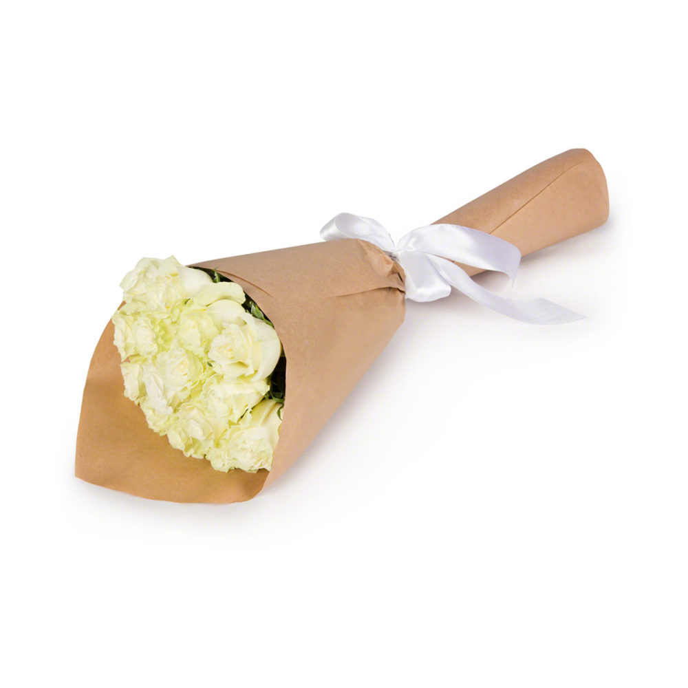Изысканный букет из 7 белоснежных роз в стильной крафтовой упаковке — воплощение чистоты и совершенства.