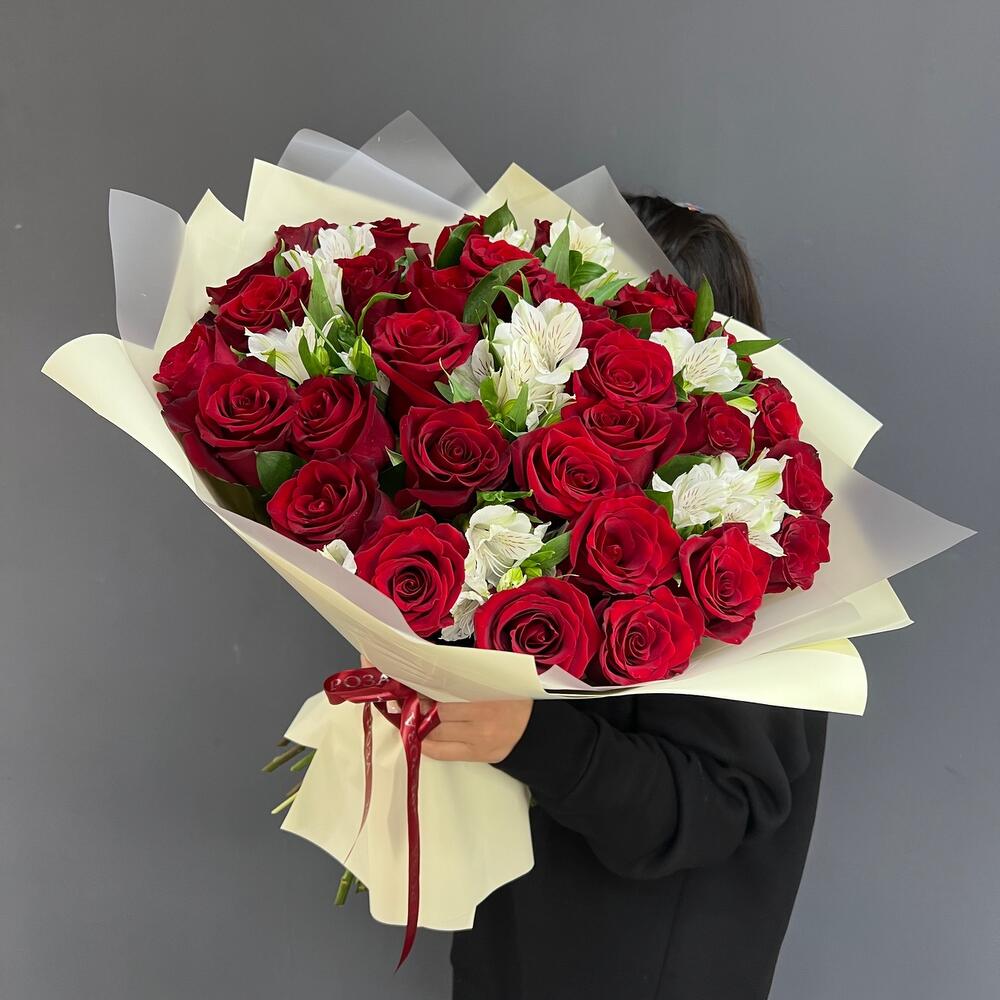 Волнующая композиция из алых роз и белоснежных альстромерий — воплощение совершенной любви. Идеальный выбор для романтического признания или годовщины отношений. Заказать букет цветов с доставкой в Альметьевске.