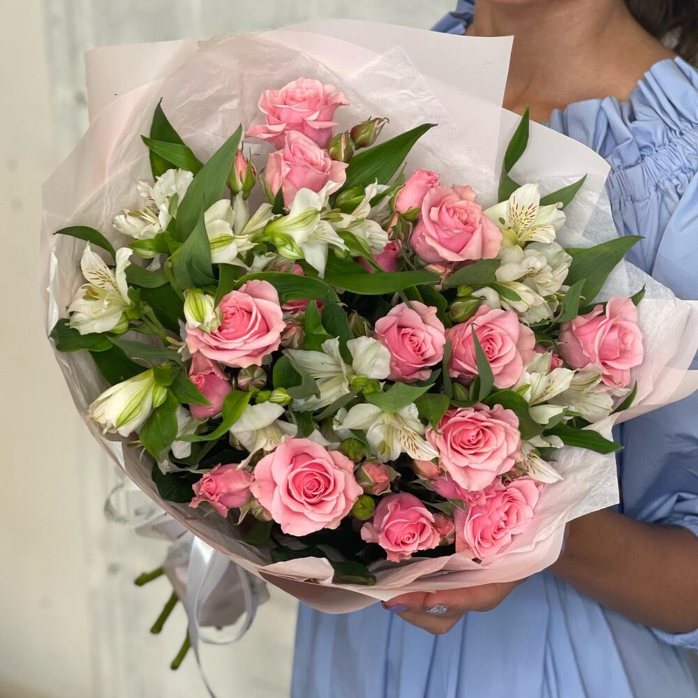 Букет «Розовый фламинго» – нежность розовых кустовых роз и белых альстромерий