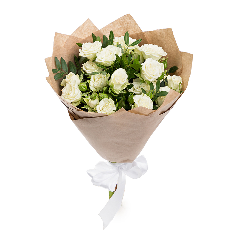 Нежная композиция из 5 белоснежных кустовых роз с фисташковой зеленью — воплощение чистоты и свежести. Идеальный выбор для свадьбы или особого признания. Магазин цветов с доставкой Альметьевск.