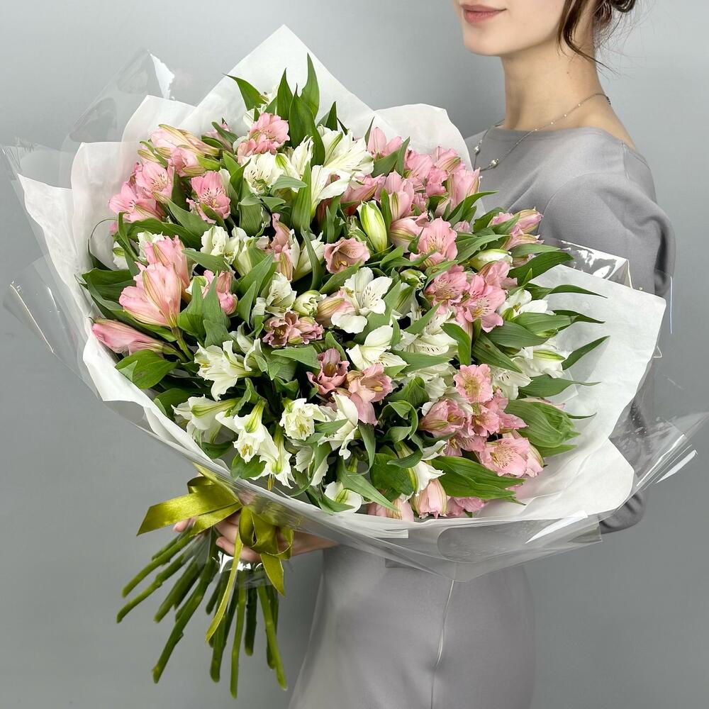 Воздушный букет «Гармония» сочетает белоснежные и нежно-розовые альстромерии, создавая идеальный баланс чистоты и нежности. Эти удивительные цветы с узорчатыми лепестками расскажут о ваших чувствах без слов. Купить альстромерии в Альметьевске.