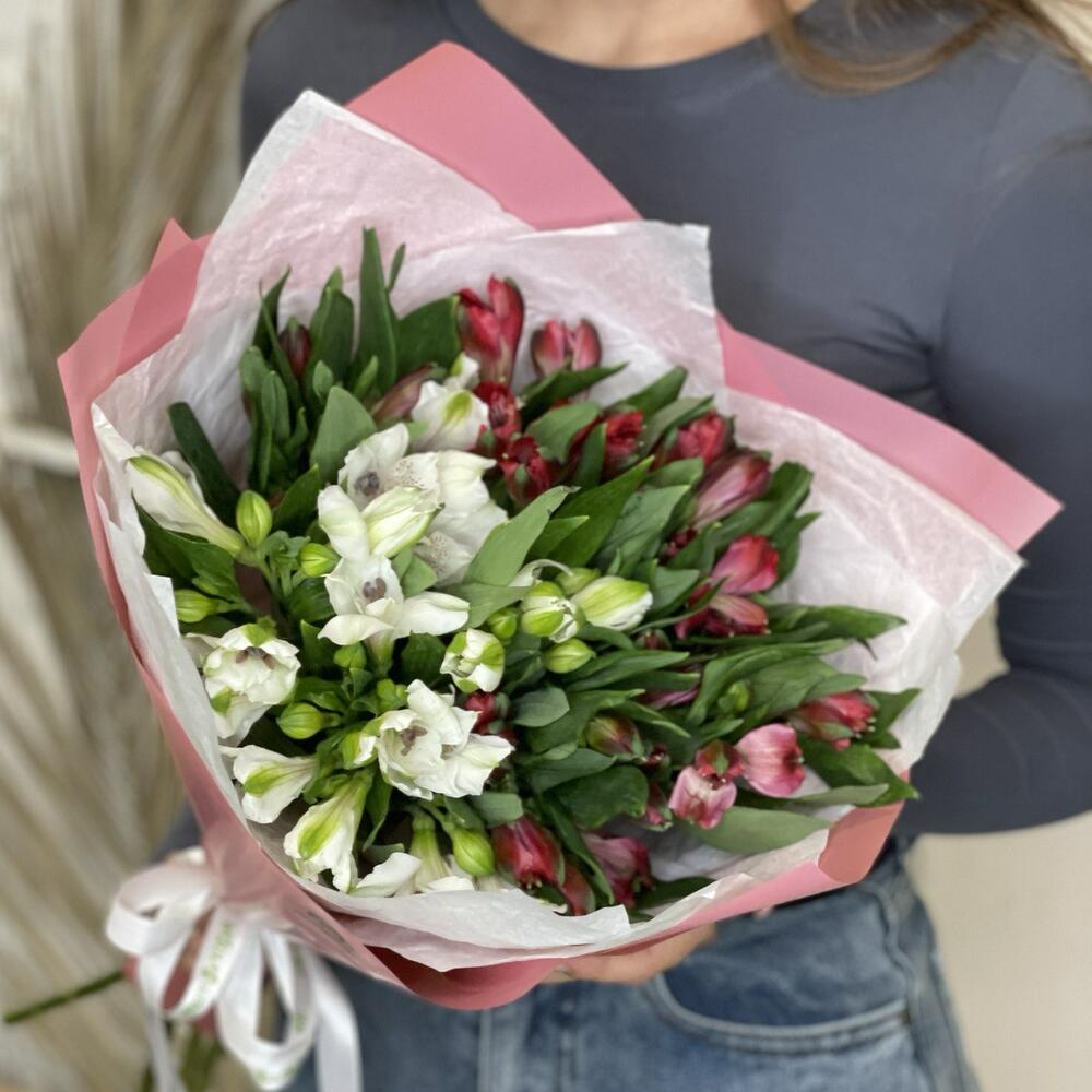 Яркий букет «Люблю» сочетает красные и белоснежные альстромерии — символ гармонии страсти и чистоты чувств. Эти удивительные цветы с узорчатыми лепестками расскажут о вашей любви лучше любых слов. Идеальный выбор для признания, годовщины или романтического сюрприза. Доставка альстромерий в Альметьевске.