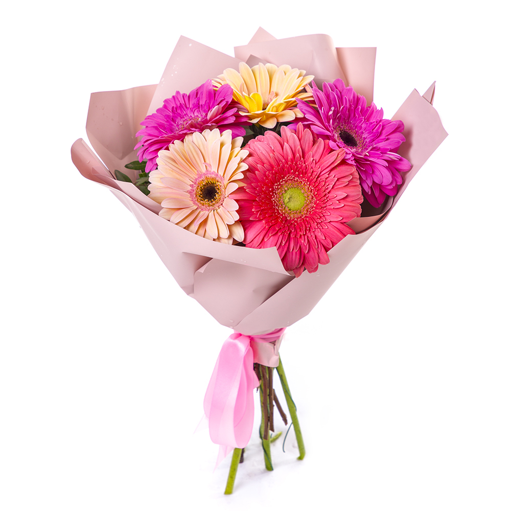 Жизнерадостная композиция из 5 свежих гербер разных цветов — воплощение летнего настроения. Идеальный выбор для подарка оптимистичному человеку. Магазин цветов Альметьевск.