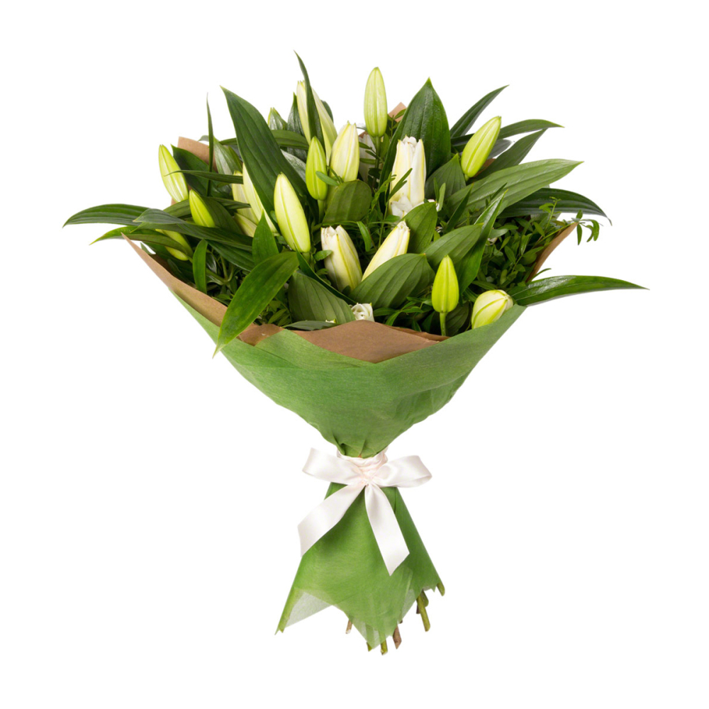 Утонченный букет из белых лилий с нежной фисташковой зеленью — воплощение свежести и изысканности. Идеальный выбор для романтического жеста или знака внимания. Букет цветов с доставкой Альметьевск.