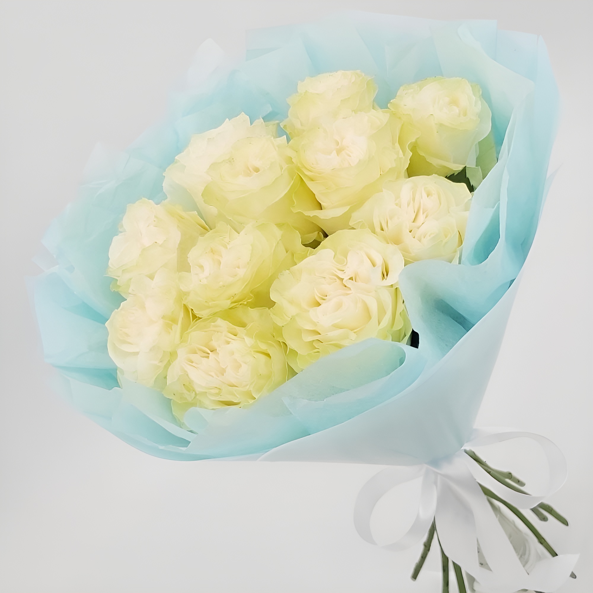 Воздушная композиция из 11 белоснежных эквадорских роз в обрамлении матовой плёнки и нежного тишью. Символ чистоты и невинности. Идеальный выбор для свадьбы, крещения или романтического признания. Заказать цветы с доставкой на дом Альметьевск.